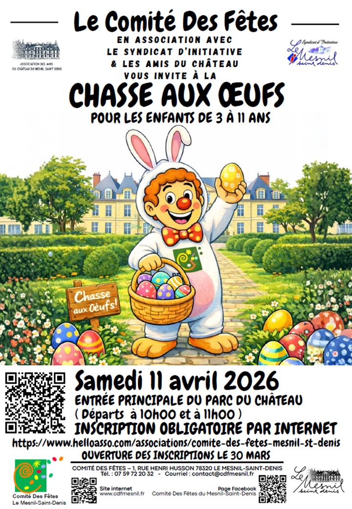 La Chasse aux œufs aura lieu le samedi 11 avril devant le château. Deux départs possibles à 10 h et 11h, réservation obligatoire à partir du 30 mars (nombre de places limité). Les informations seront disponibles à partir du 26 mars sur les réseaux sociaux et affichage chez les commerçants.